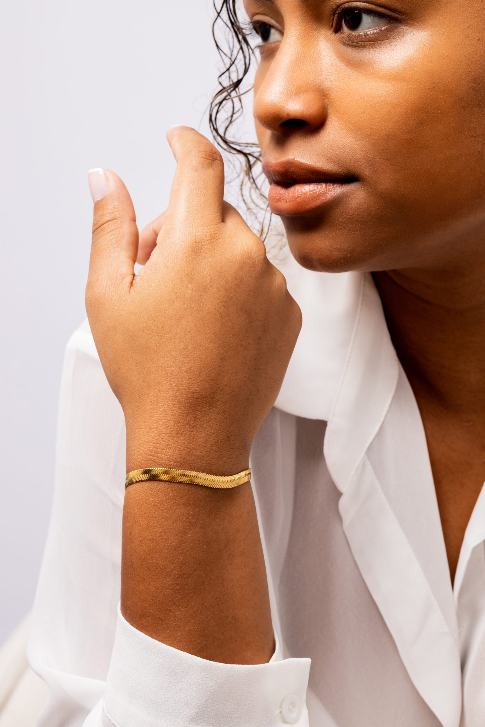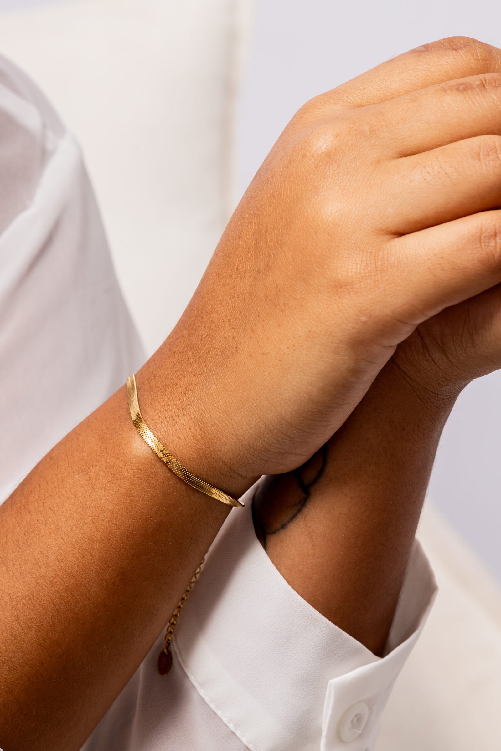 Discover the elegance of the Evy bracelet, a modern jewel that combines sophistication and versatility. This gold chain bracelet is made up of interlocking flat links, creating a smooth and flexible surface that refers to the texture of a snake scale or a herringbone pattern. Crafted from stainless steel with a luxurious 18k gold plating, the Evy bracelet features a shiny finish that reflects light, highlighting its golden color and adding a special touch to any look.
