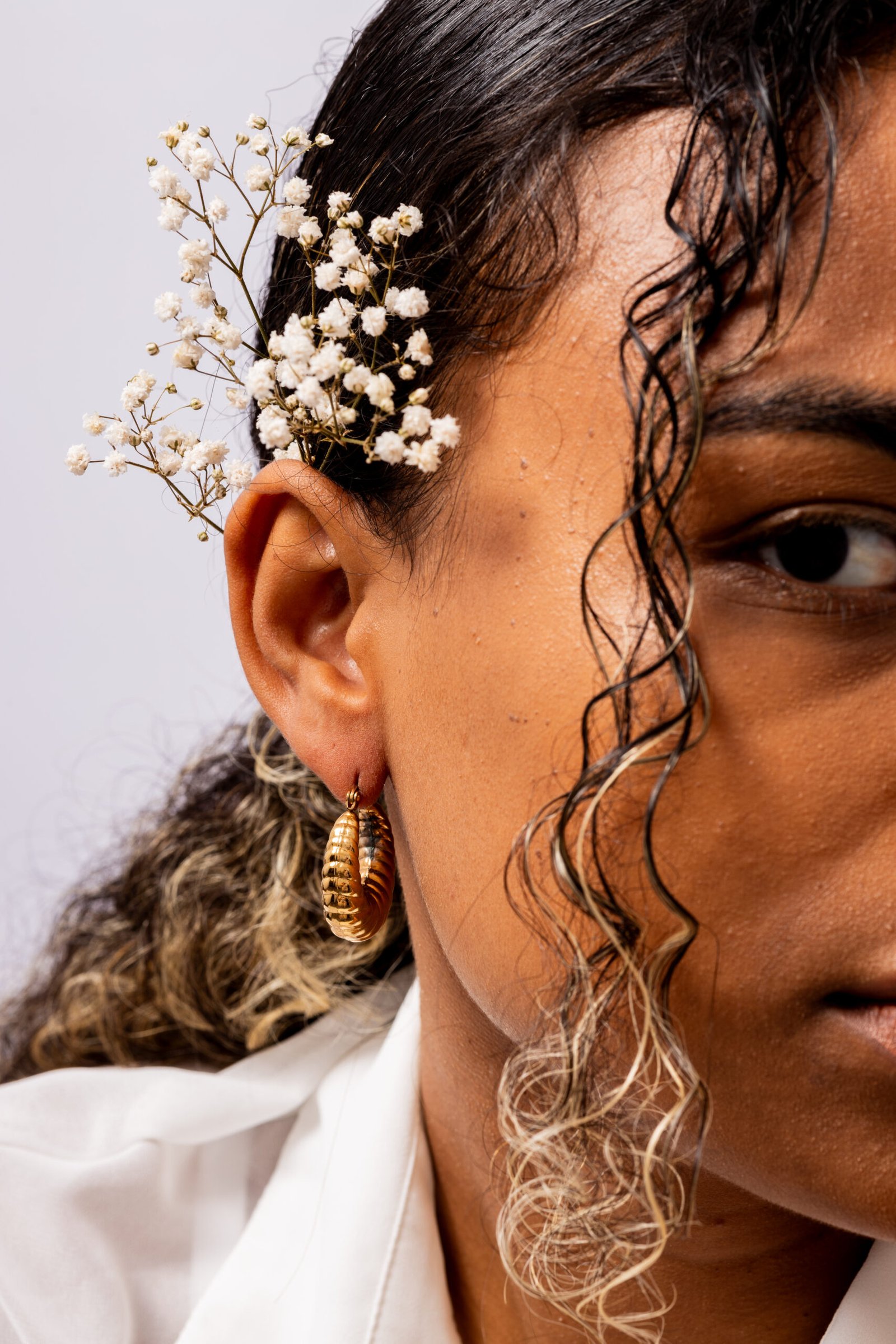 Presenting the Dalia earring, a standout piece that combines sophisticated design with retro style. With a chunky twisted hoop shape, Dalia features a spiral texture that gives volume and elegance to the accessory. Its striking aesthetic is inspired by updated vintage trends, making it ideal for complementing neutral and classic looks with a special touch. The Dalia earring is perfect for those who want accessories with personality, without sacrificing sophistication. Its click (hook) closure ensures security and ease of use, offering comfort all day long. Available in satin gold, Dalia is made from stainless steel and 18k PVD gold plated, ensuring durability and resistance. It is also hypoallergenic, keeps its color, and doesn’t turn green, making it ideal for sensitive skin. Add a touch of shine and elegance to your look with the Dalia earring, a piece that stands out for its beauty and quality.