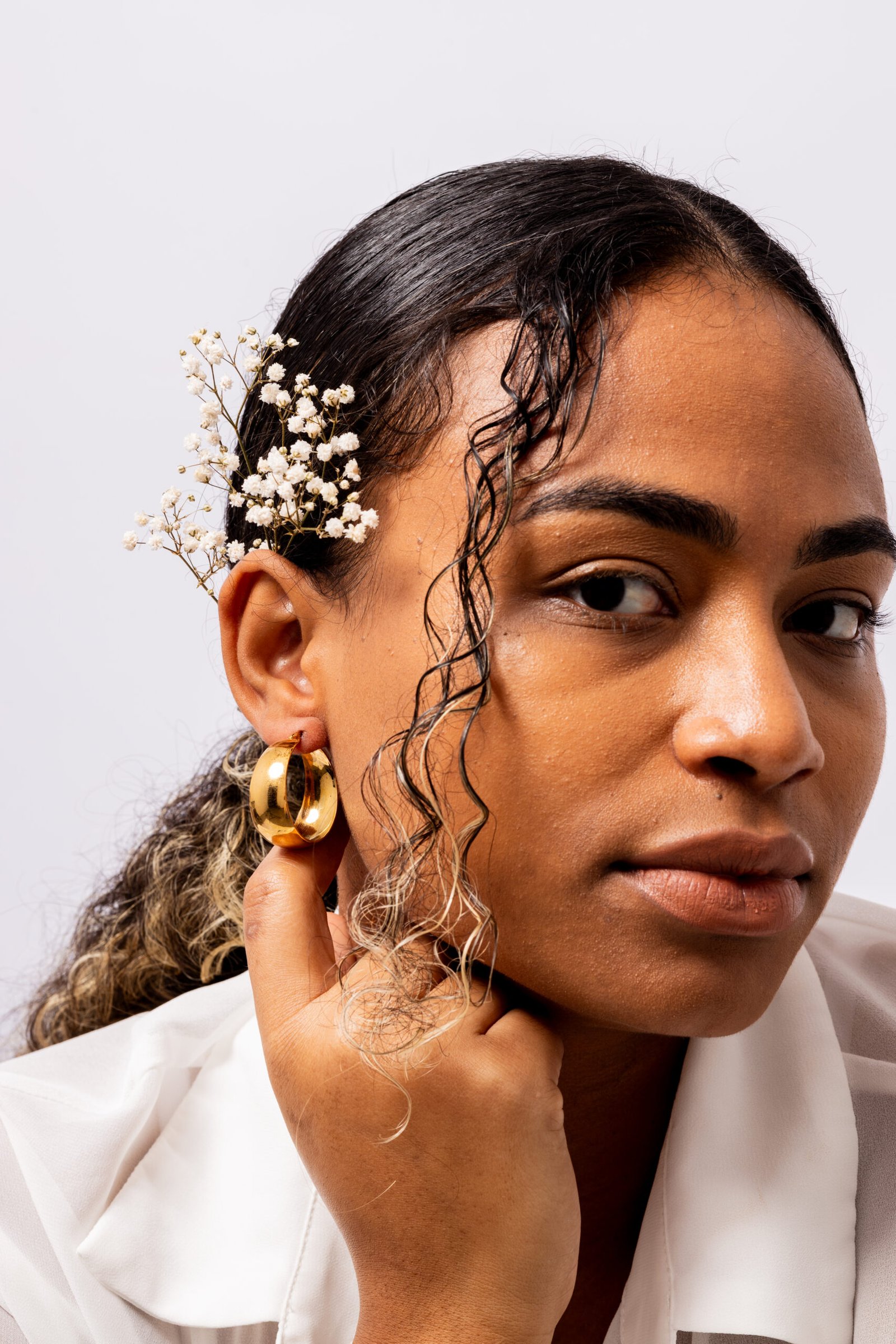 Introducing Doja, a medium hoop that combines elegance and modernity with a bold and voluminous design, ideal for highlighting the metal’s shine. With a slightly twisted structure, this piece offers a contemporary touch, while its mirrored surface provides a sophisticated and clean finish. The Doja earring is perfect for classic, minimalist, or elegant looks, making it a versatile choice in your jewelry box. Its versatility allows you to transition easily from work to evening events, always in style. Equipped with a click (hook) closure, the earring is practical and secure, providing comfort all day. With a metallic gold mirrored finish, Doja is made from stainless steel, 18k PVD gold plated, and is hypoallergenic, ensuring lasting color and no irritation. Add Doja to your collection and enjoy a refined earring that combines quality and exceptional design. Experience the elegance that a mirrored hoop can bring to your look.