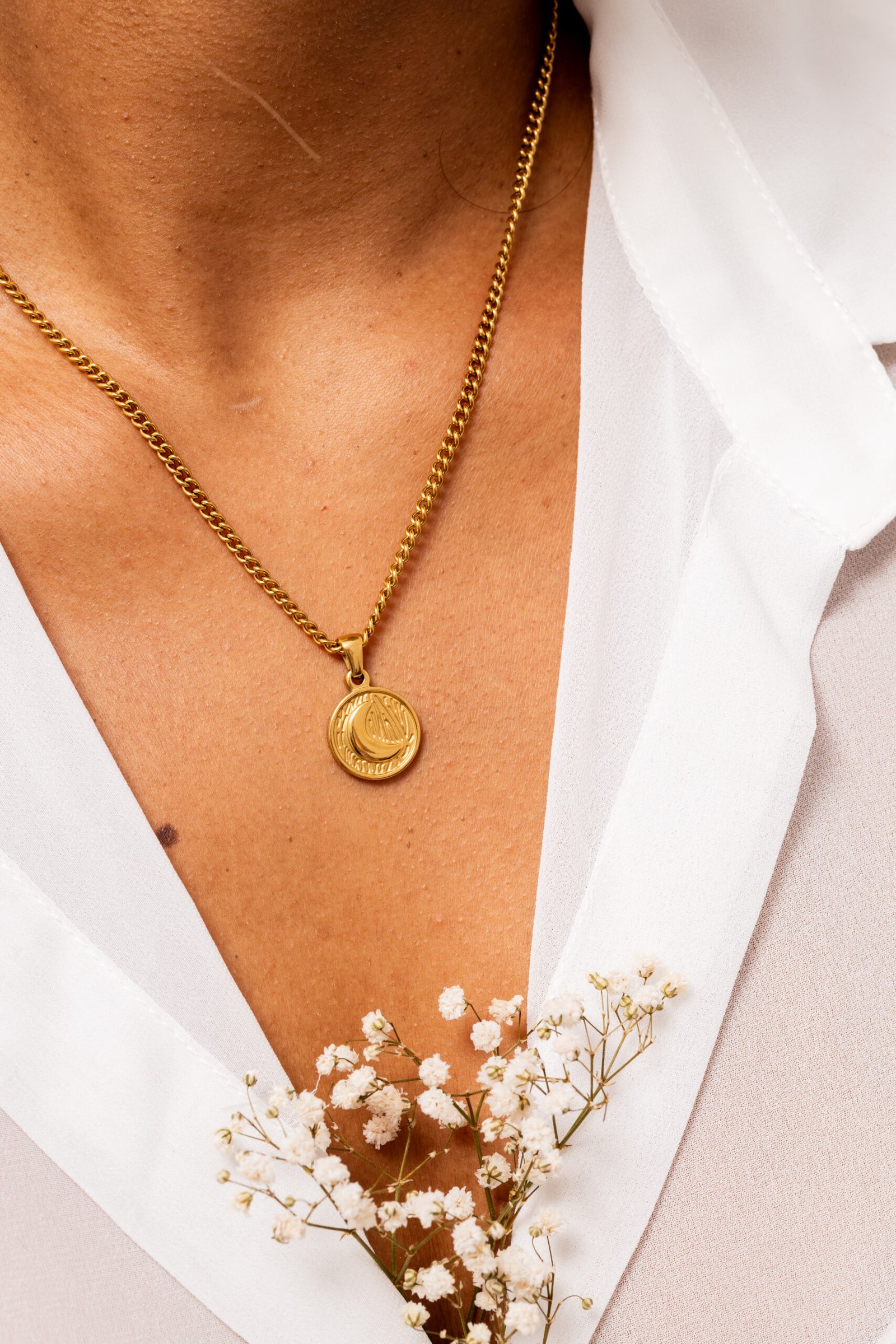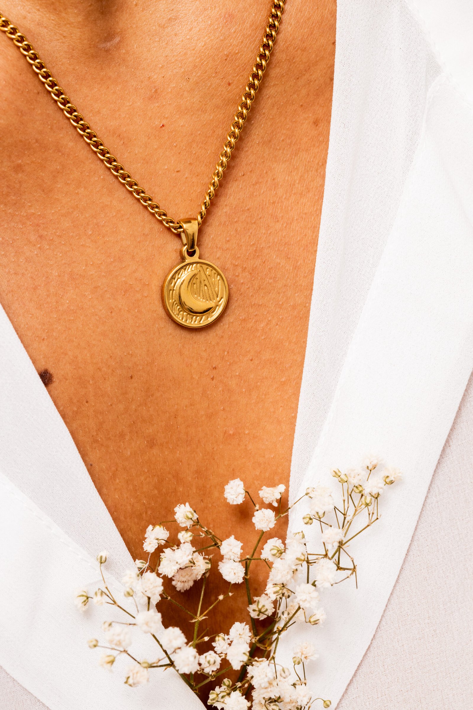 Discover the Sia necklace, an accessory that blends elegance and mysticism in a unique design. This gold-plated moon medallion necklace is made from a high-quality metal alloy, ensuring lasting durability and a distinctive shine.