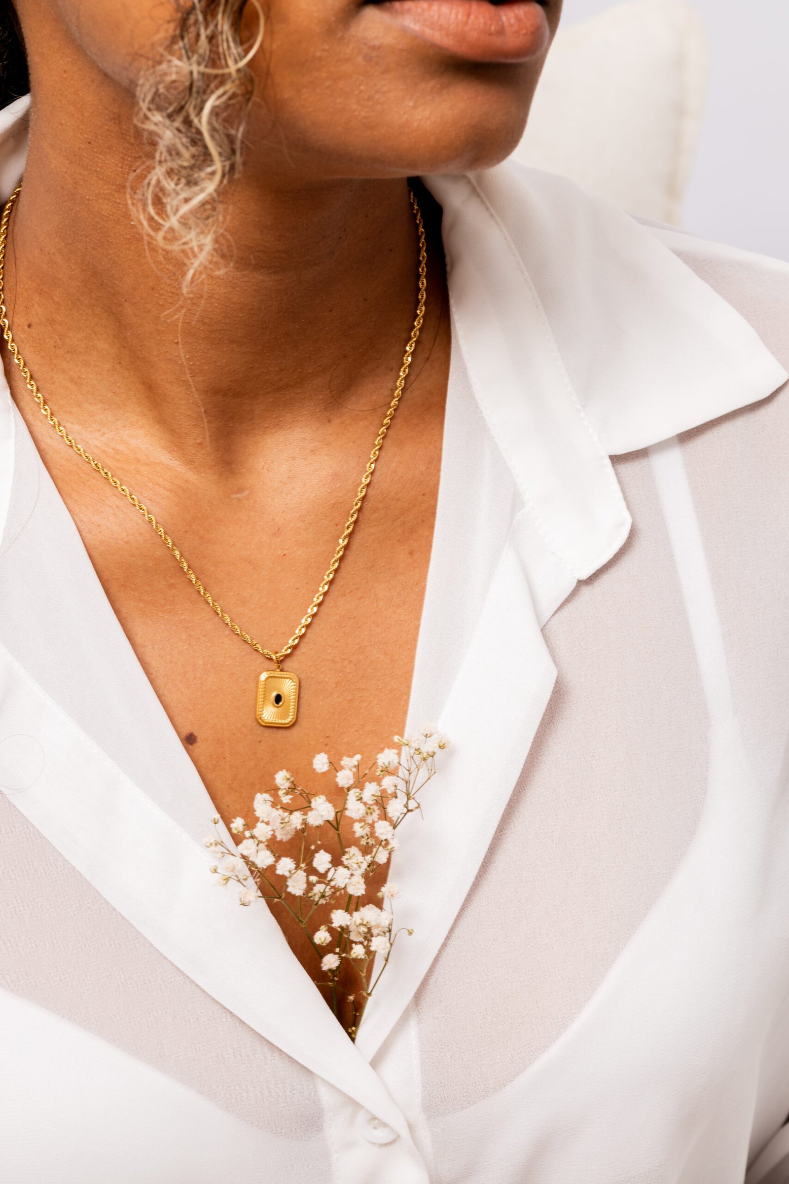 Make an impact with the Venus Necklace, featuring a gold-plated rectangular pendant with a raised texture and central black stone. Designed with a twisted rope chain and minimalist elegance, this mid-length necklace is ideal for layering or solo wear. A bold and timeless piece for elevating daily looks or making a statement on special occasions.