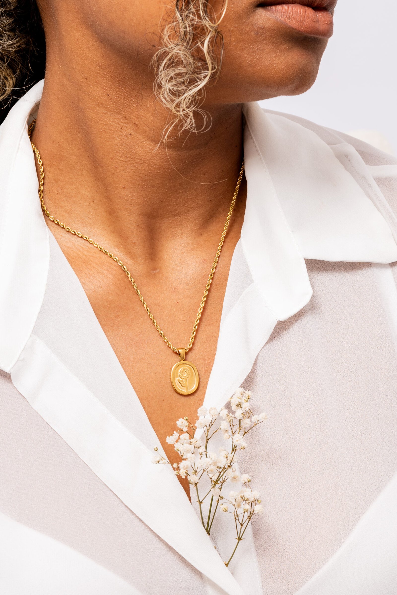 Discover the elegance of the Flower Medallion Necklace, a delicate piece of jewellery that combines sophistication and meaning. Plated in 18k gold, this necklace features a domed design that beautifully reflects light, making it an essential accessory for any occasion.