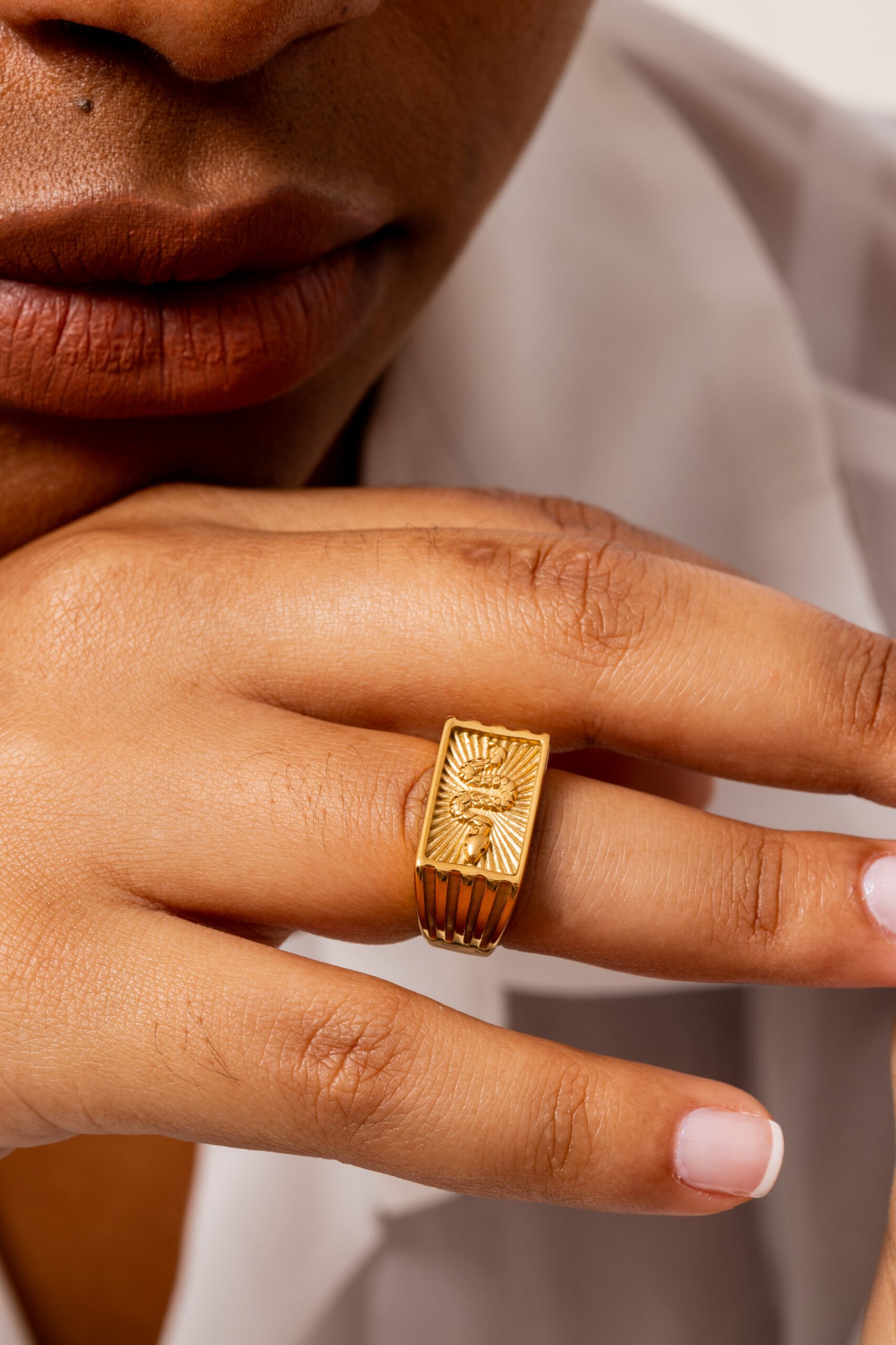 Stainless steel ring with 18K gold plating, featuring an exclusive signet-style design with a matte embossed snake and lightning bolts. The sides are detailed with vertical grooves, giving it a bold and modern look. Hypoallergenic and water-resistant. Perfect for those seeking style and authenticity.