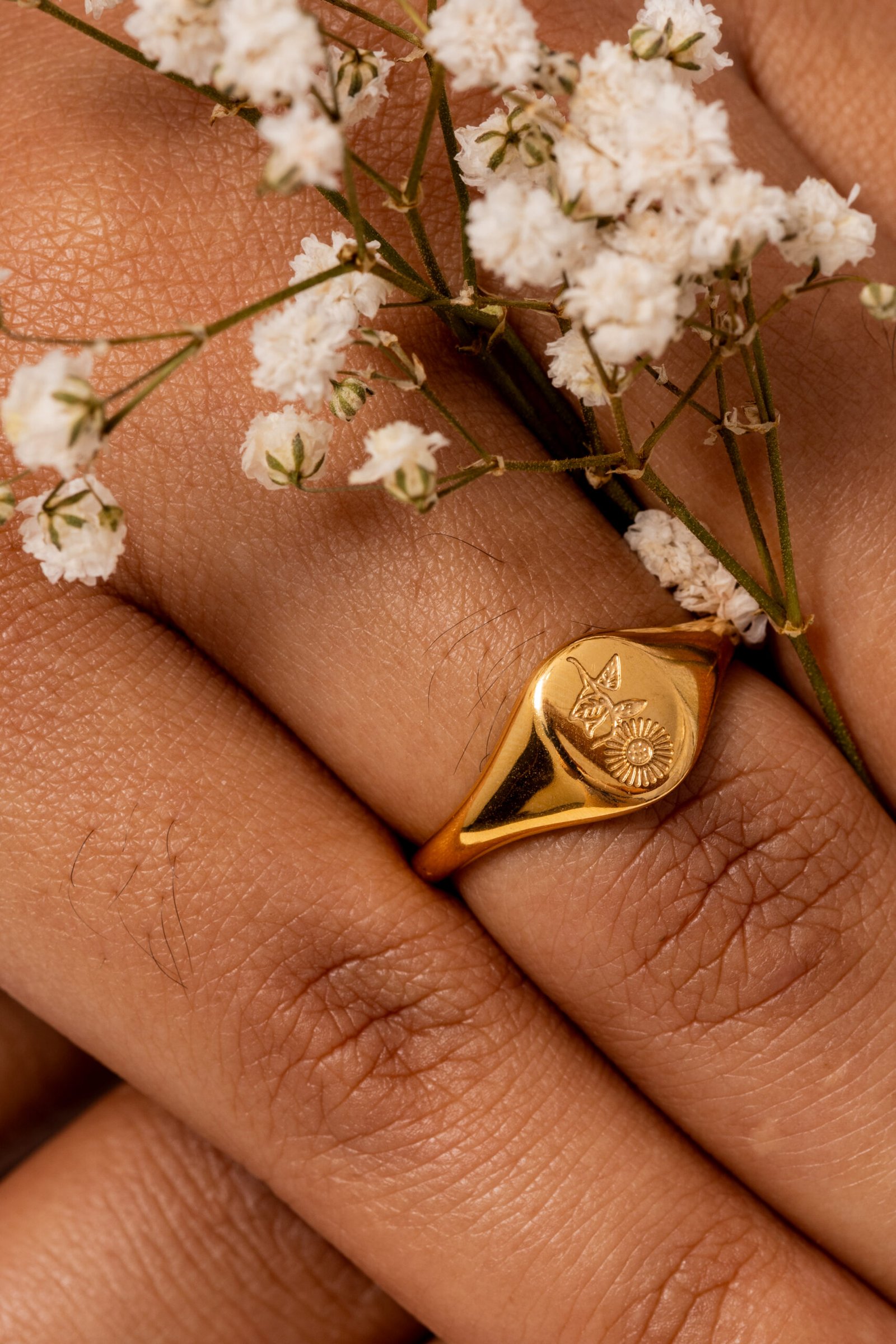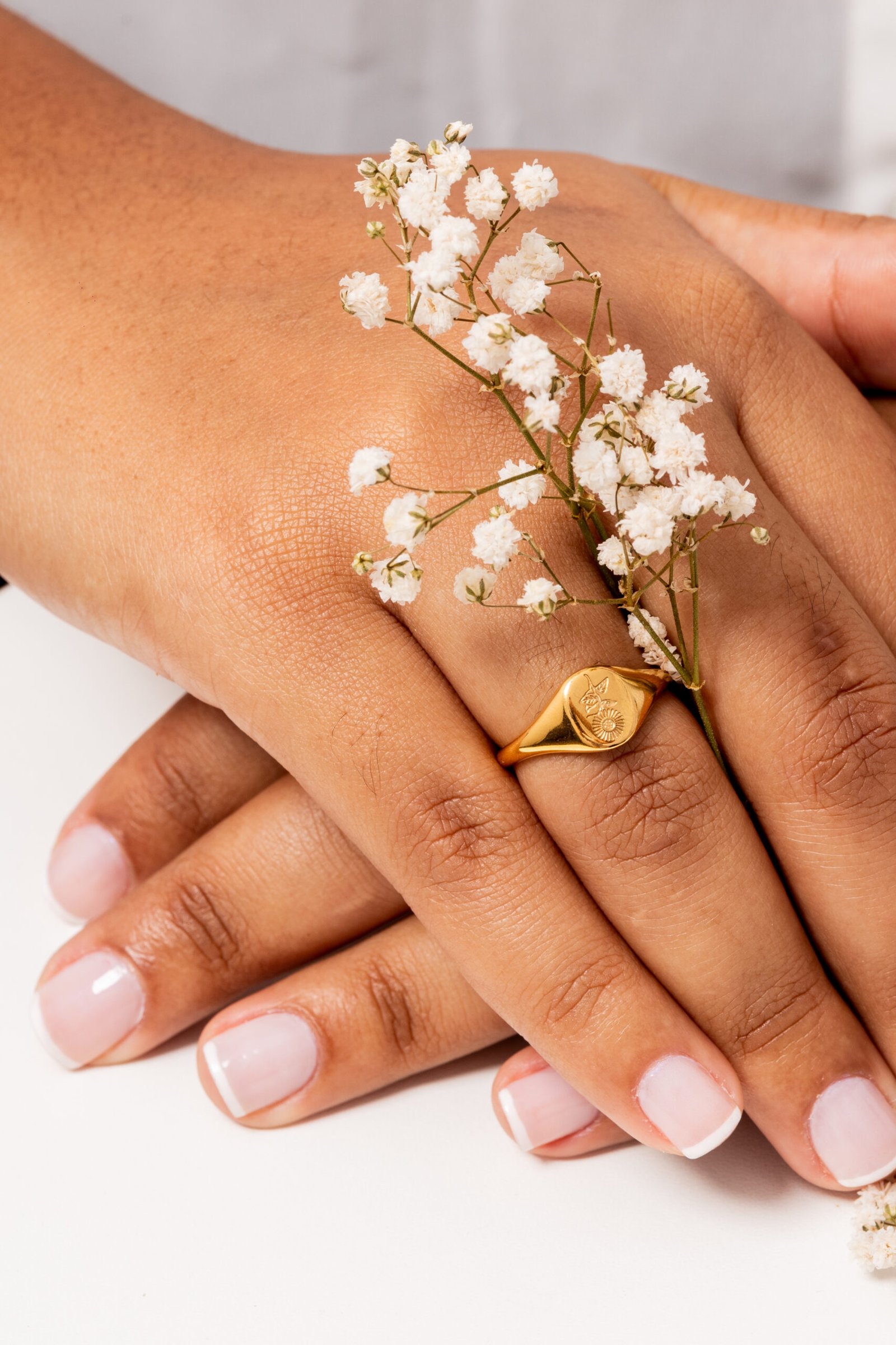 Brighten up your look with the timeless beauty of our gold sunflower ring. Crafted from high-quality stainless steel and ever so delicately 18k gold plated, this piece of jewellery combines exceptional durability with a long-lasting, luxurious shine. The charming design features a dainty sunflower engraved on the surface, a proper symbol of joy, vitality, and good vibes.